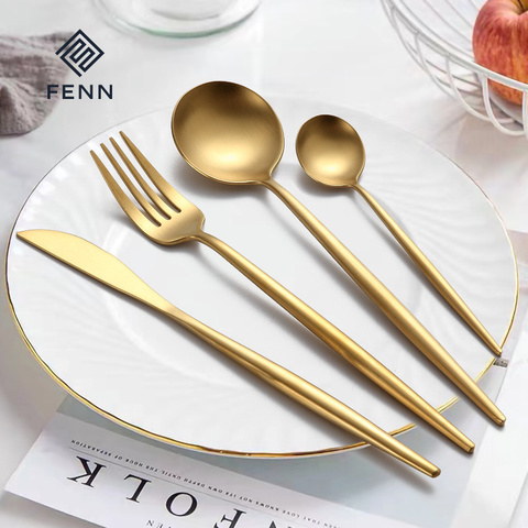 FENN 304 Роскошные столовые приборы серебряные столовые приборы из нержавеющей стали ложка и вилка набор ножей свадебный отель португальский Золотой столовый прибор